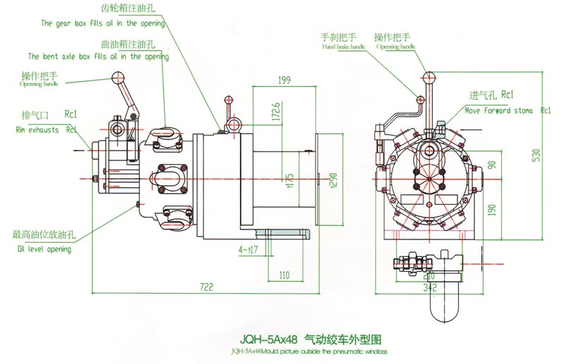 JQH-5Ax48氣動絞車,采用壓縮空氣為動力,推動TMH4A活塞式氣動馬達工作。再通過二級齒輪減速,把扭矩傳給滾筒。氣動絞 車的操縱.是靠馬達體上的手操縱轉向閥實現(xiàn)正轉、反轉、停止等項動作。為保證氣動絞車的安全性,該氣動絞車還具有手剎車功能。特 別適合于礦山、建筑工程以及海上、陸地油田鉆井二層平臺上之用。